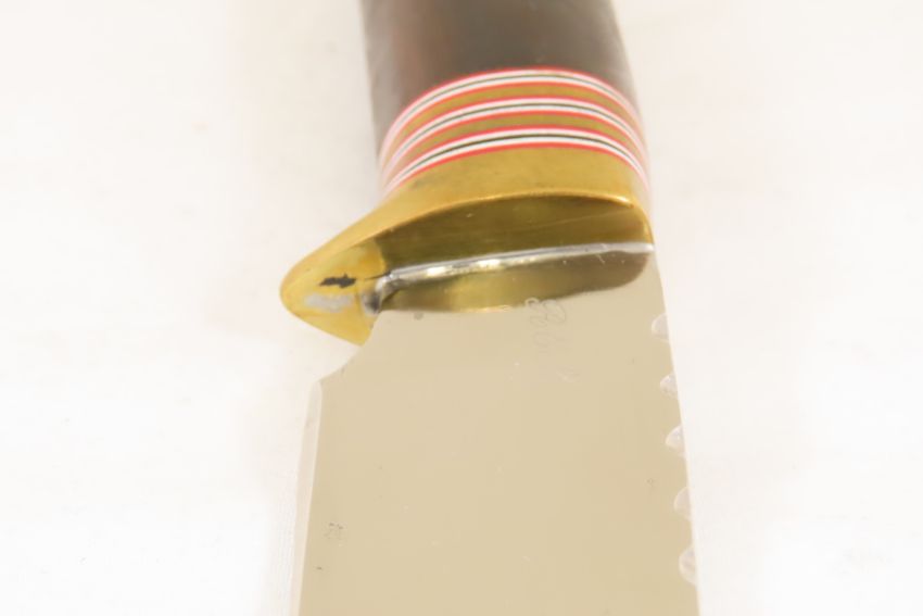 Hand Made Custom Knife by Dr. Robert E Molenaar 5160 steel blade with file work, brass guard & butt, fiber & brass spacers. Desert ironwood handle blade measures 5.25 inches, 10 inches overall. Signed R.E.M. Please ask questions & read terms and conditions before bidding.