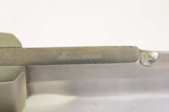 Hand Made Custom Knife by Dr. Robert E Molenaar Steel blade with nickel silver guard, hard wood or composite material handle blade measures 5.25 inches 10.25 inches overall Signed Molenaar on spine Please ask questions & read terms and conditions before bidding.