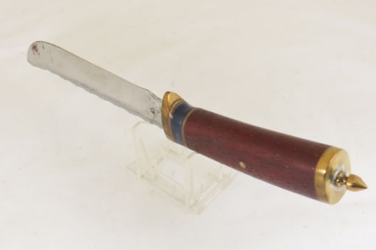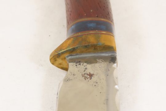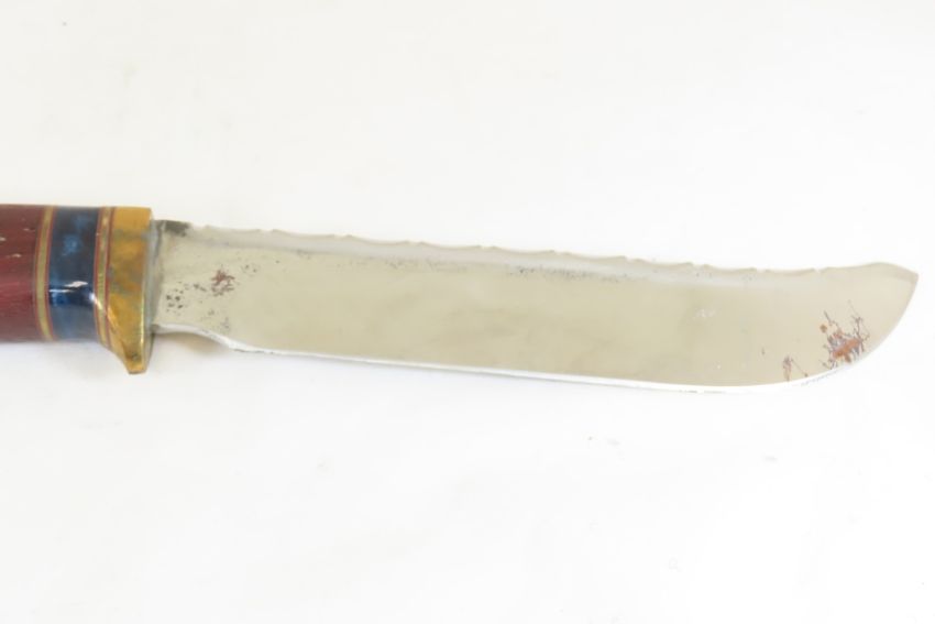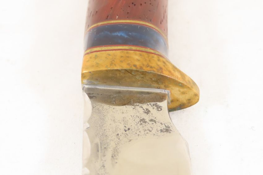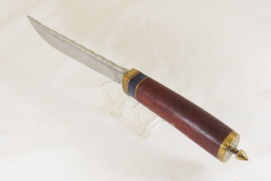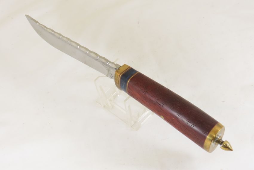 Hand Made Custom Knife by Dr. Robert E Molenaar Steel blade with file work, & forge patina, brass guard & butt with keeper button for strap, wood handle, blade measures 6.25 inches 11.5 inches overall Signed R.E.M. Please ask questions & read terms and conditions before bidding.