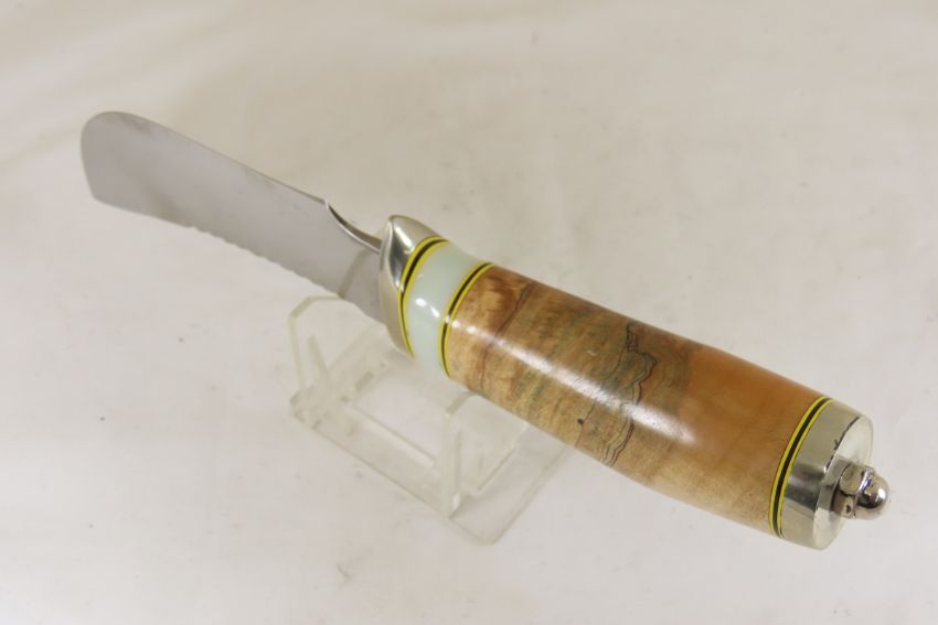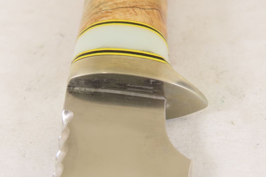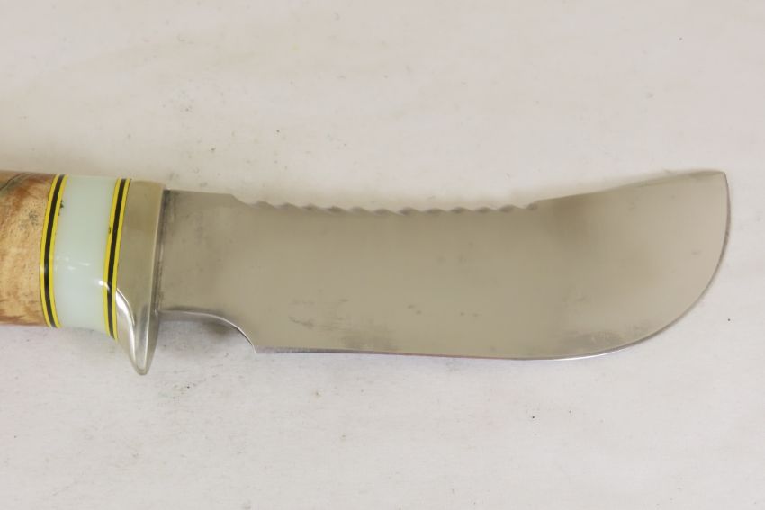 Hand Made Custom Knife by Dr. Robert E Molenaar 5160 flat grind wide hunter blade with file work, nickel silver guard & butt, fiber & Corian spacers. spalted Maple handle, blade measures 4.75 inches 9.5 inches overall. Signed R.E.M. Please ask questions & read terms and conditions before bidding.