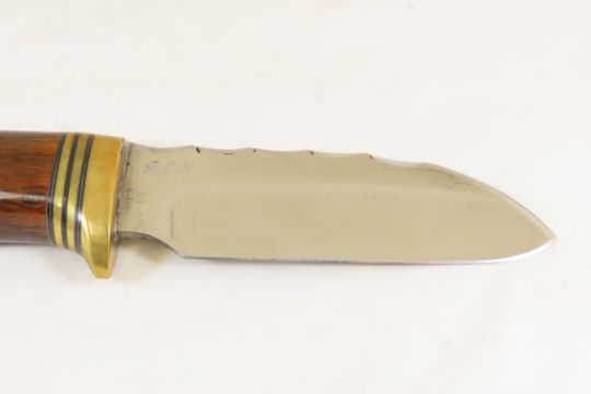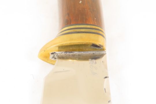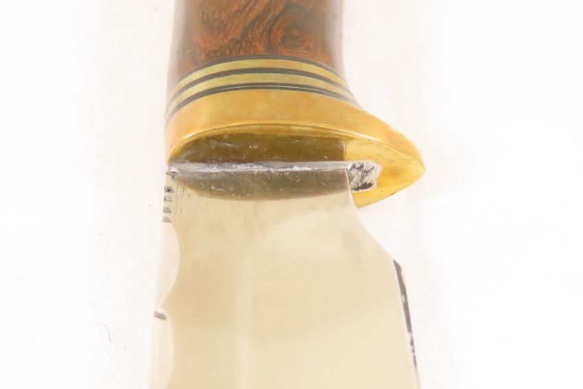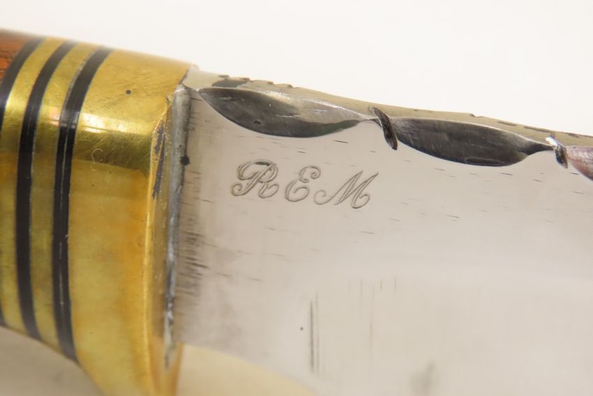 Hand Made Custom Knife by Dr. Robert E Molenaar 5160 steel hollow ground drop point blade with file work, desert ironwood Handle with brass fittings. Blade measures 3.75 inches 8.75 inches overall. Signed R.E.M. Please ask questions & read terms and conditions before bidding.
