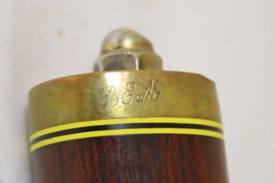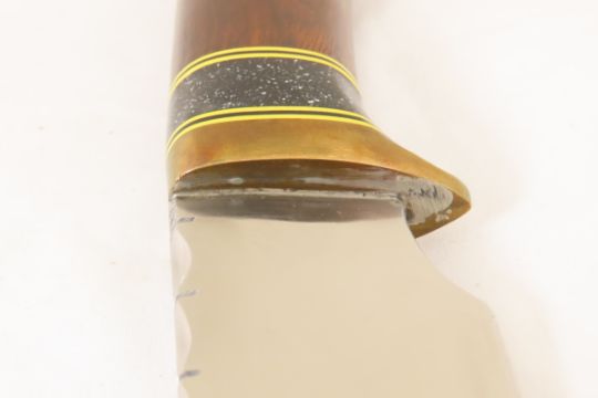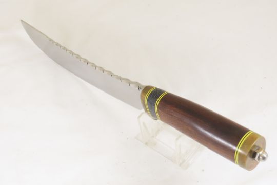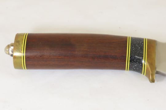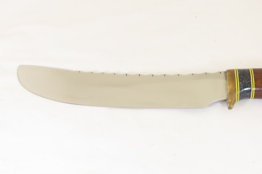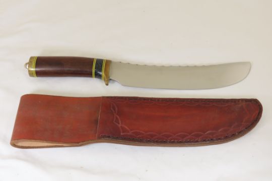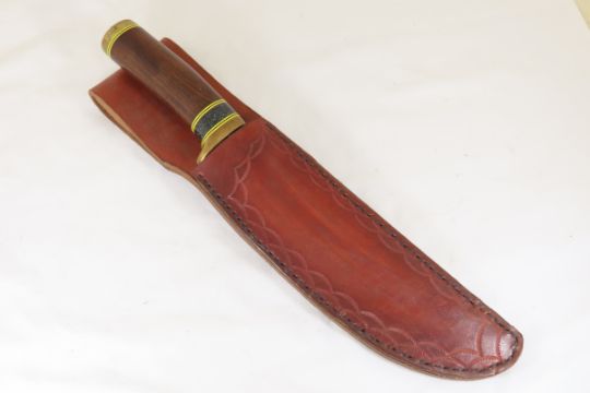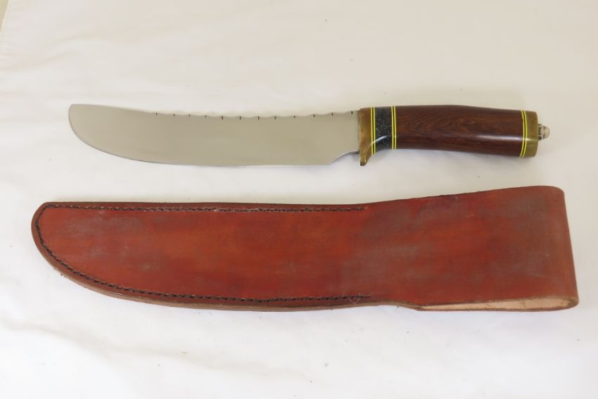 Hand Made Custom Knife by Dr. Robert E Molenaar Steel blade with file work, brass guard & butt, fiber & Corian spacers. Dark wood handle, blade measures 8.5 inches, 14 inches overall, includes hand tooled custom leather sheath. Signed R.E.M. Please ask questions & read terms and conditions before bidding.
