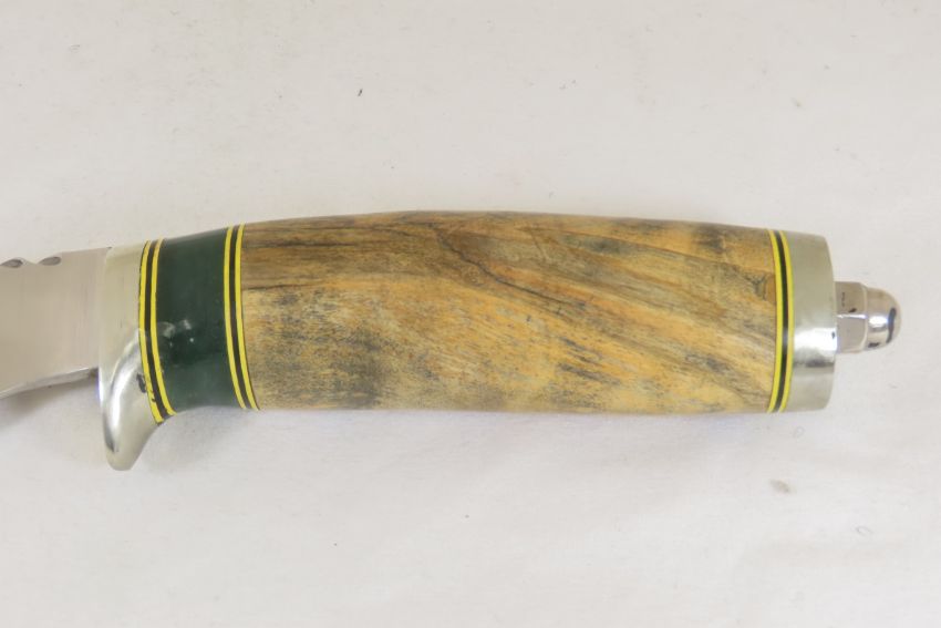 Hand Made Custom Knife by Dr. Robert E Molenaar 5160 steel blade with rope file work, 416 stainless guard & butt, fiber & Korean spacers stabilized Box Elder wood handle, blade measures 5.25 inches, 10 inches overall. Signed R.E.M. Please ask questions & read terms and conditions before bidding.
