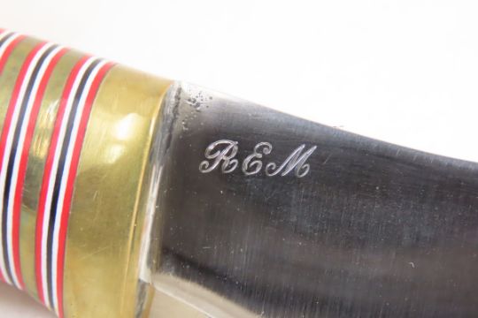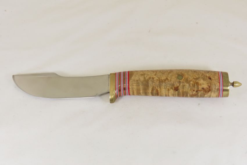 Hand Made Custom Knife by Dr. Robert E Molenaar Steel blade with brass fittings, fiber spacers & button for keeper strap, wood handle, blade measures 4.25 inches 9.5 inches overall. Signed R.E.M. Please ask questions & read terms and conditions before bidding.