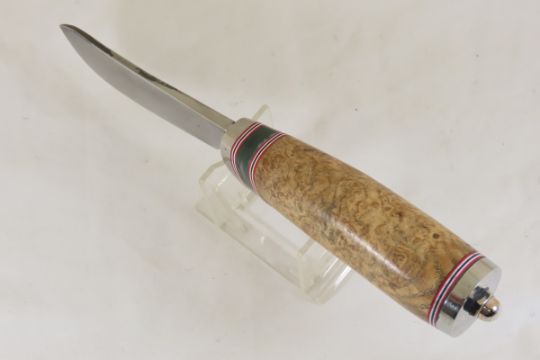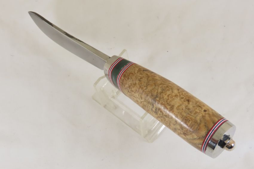 Hand Made Custom Knife by Dr. Robert E Molenaar 5160 steel short Skinner knife, nickel silver guard & butt, fiber & Corian spacers. burled ash stabilized handle, blade measures 4 inches 8.5 inches overall. Signed R.E.M. Please ask questions & read terms and conditions before bidding.