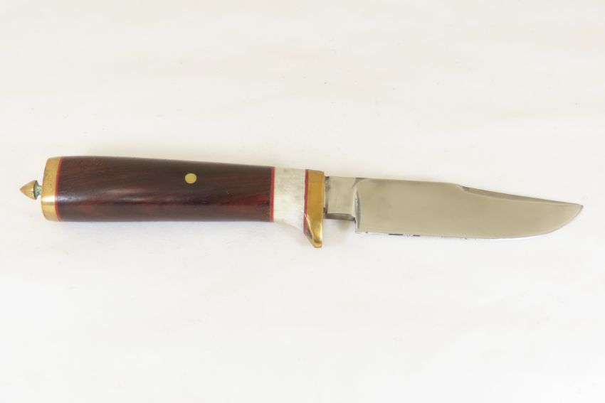 Hand Made Custom Knife by Dr. Robert E Molenaar D2 steel stock ground blade, brass guard & button butt for keeper strap, fiber & horn spacers. ironwood handle, blade measures 4.5 inches 9.75 inches overall. Signed R.E.M. Please ask questions & read terms and conditions before bidding.
