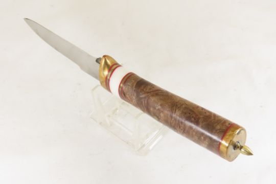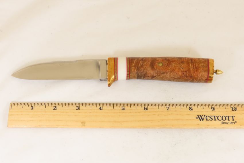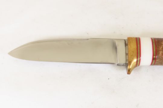 Hand Made Custom Knife by Dr. Robert E Molenaar Drop point steel blade with brass guard & butt with button for keeper strap. Wood handle with brass & fiber spacers. Blade measures 4.5 inches 9.75 inches overall. Please ask questions & read terms and conditions before bidding.