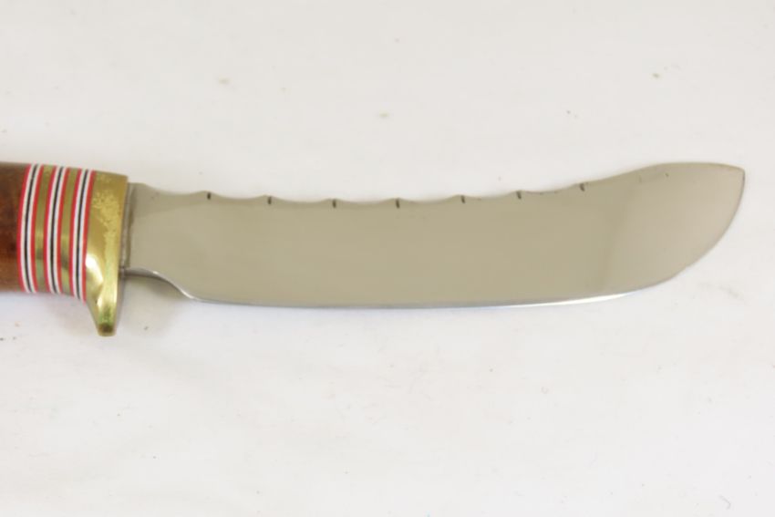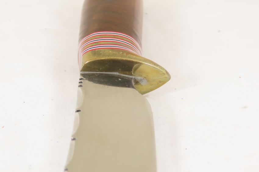 Hand Made Custom Knife by Dr. Robert E Molenaar Steel blade with file work, brass guard & butt with fiber spacers, wood handle, blade measures just over 5 inches. 9.75 inches overall, includes custom hand tooled leather sheath. Signed R.E.M. Please ask questions & read terms and conditions before bidding.