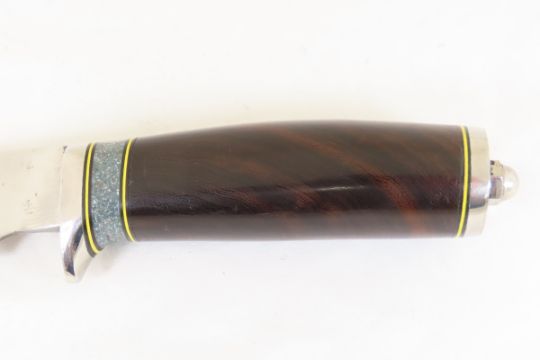Hand Made Custom Knife by Dr. Robert E Molenaar Steel blade with finger notch, nickel silver guard & butt, dark wood handle with fiber & Corian spacers. Blade measures 5 inches, 10 inches overall. Signed R.E.M. Please ask questions & read terms and conditions before bidding.
