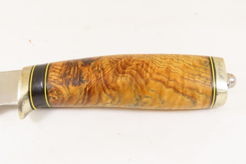 Hand Made Custom Knife by Dr. Robert E Molenaar Steel blade with finger notch, Nickel silver fittings, Corian & fiber spacers. Wood handle blade measures 4.75 inches 9.5 inches overall, includes custom hand tooled leather sheath. Signed R.E.M. Please ask questions & read terms and conditions before bidding.
