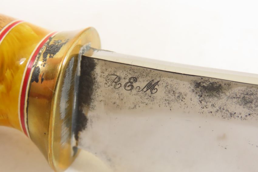 Hand Made Custom Knife by Dr. Robert E Molenaar Hand forged 5160 steel blade with patina, flared brass guard, Amber & fiber spacers. Oak handle, blade measures 4.5 inches 9.25 inches overall Signed R.E.M. Please ask questions & read terms and conditions before bidding.