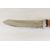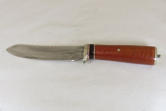 Hand Made Custom Knife by Dr. Robert E Molenaar Damascus style steel blade with file work, wood handle, button for keeper Strap, blade measures 5.5 inches 10.75 inches overall. Signed R.E.M. Please ask questions & read terms and conditions before bidding.