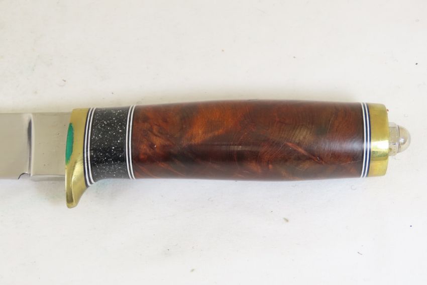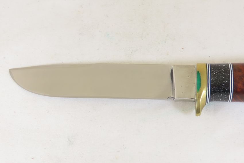 Hand Made Custom Knife by Dr. Robert E Molenaar Steel blade with brass guard & butt, Corian & fiber spacers. Wood handle, blade measures 5.25 inches, 10 inches Overall, includes custom-made leather sheath. Signed R.E.M. Please ask questions & read terms and conditions before bidding.
