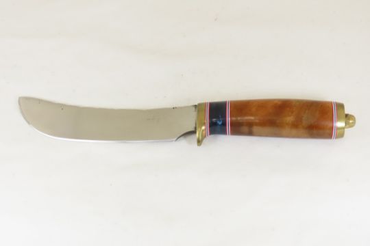 Hand Made Custom Knife by Dr. Robert E Molenaar 5160 steel blade with forge patina spine, brass guard & butt, stabilized box Elder wood handle with fiber & Corian spacers. Blade measures 5.75 inches, 10.5 inches overall. Signed R.E.M. Please ask questions & read terms and conditions before bidding.