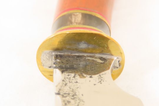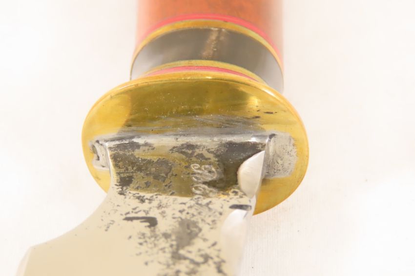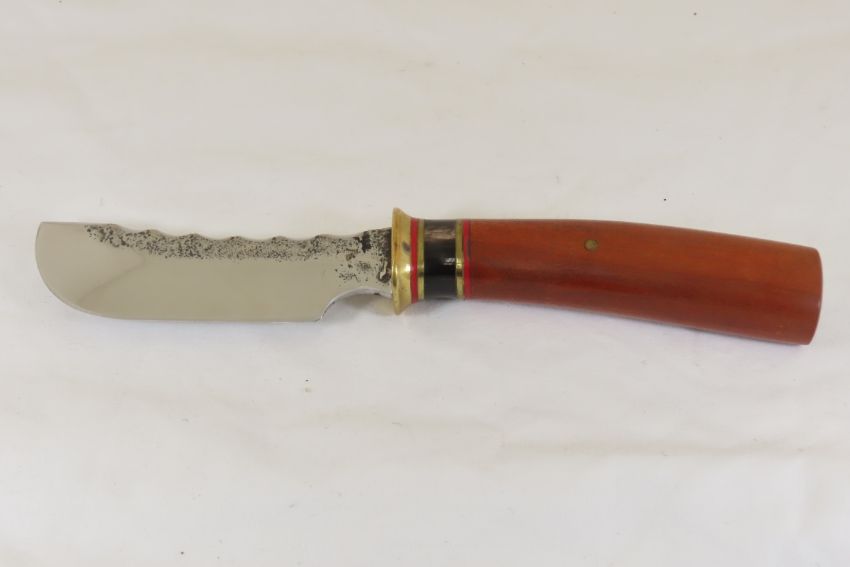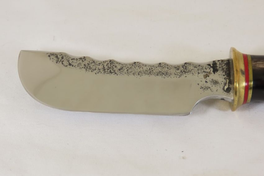 Hand Made Custom Knife by Dr. Robert E Molenaar 5160 steel blade with file work, forge patina, flared brass guard, brass & Corian spacers. Pink ivory wood handle blade measures 4 inches, overall just over 8.5 inches. Signed R.E.M. Please ask questions & read terms and conditions before bidding.