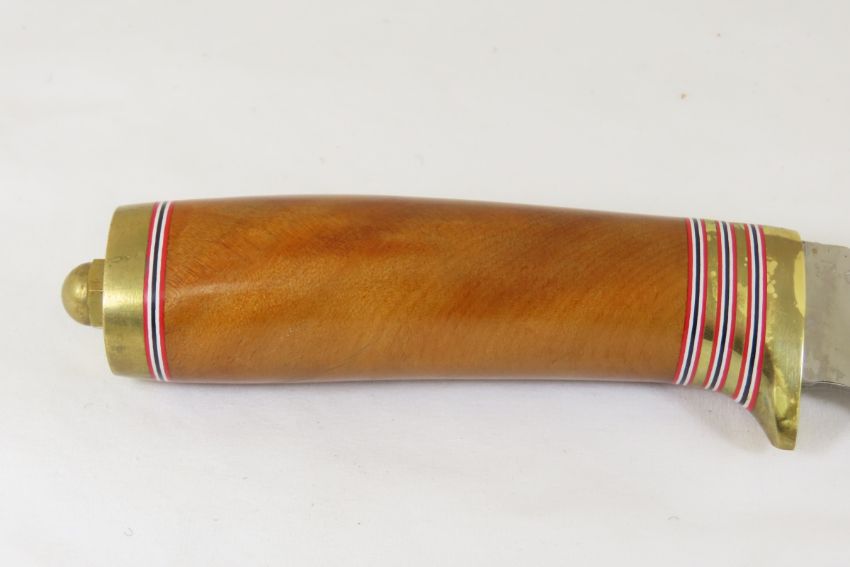 Hand Made Custom Knife by Dr. Robert E Molenaar Steel blade with forge patina on spine, brass guard & butt with brass & fiber spacers, wood handle, blade measures 4.5 inches 9.25 inches Overall, includes custom hand tooled leather Sheath. Signed R.E.M. Please ask questions & read terms and conditions before bidding.