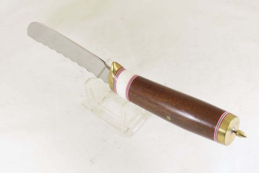 Hand Made Custom Knife by Dr. Robert E Molenaar Steel blade with file work, brass guard & butt with button for keeper strap. Dark wood handle with fiber spacers. Blade measures 5.25 inches, 10.5 inches overall. Signed R.E.M. Please ask questions & read terms and conditions before bidding.