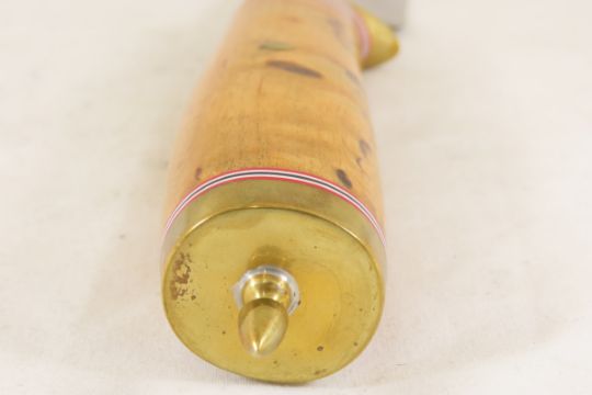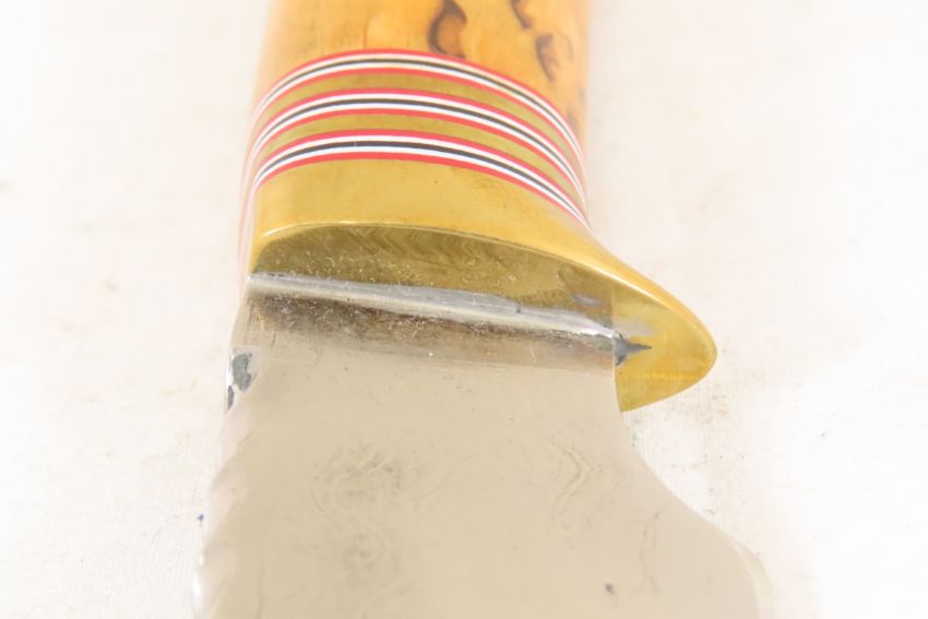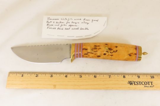 Hand Made Custom Knife by Dr. Robert E Molenaar Damascus blade with file work, brass guard & button butt for keeper's strap, brass & fiber spacers. Birch root wood handle, blade measures 4.5 inches, 10 inches overall. Signed R.E.M. Please ask questions & read terms and conditions before bidding.