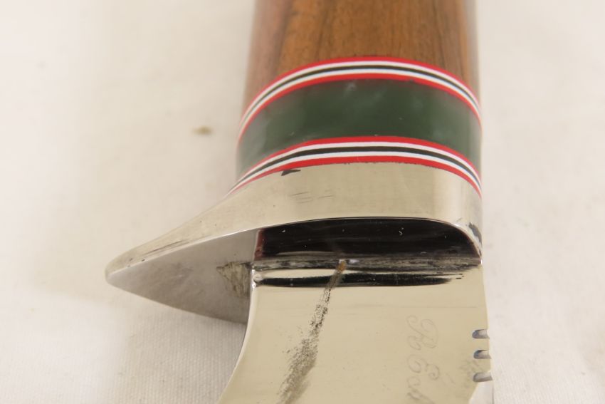 Hand Made Custom Knife by Dr. Robert E Molenaar 5160 steel blade with file work, 416 stainless steel guard & butt, fiber & Corian spacers. Ash handle, blade measures 5.25 inches, 10 inches overall. Signed R.E.M. Please ask questions & read terms and conditions before bidding.