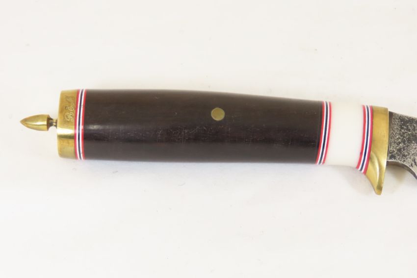 Hand Made Custom Knife by Dr. Robert E Molenaar Steel blade with forge patina, brass guard & butt with button for keeper strap, wood handle with fiber spacers. Blade measures 3.25 inches, 8.75 inches overall. Signed R.E.M. Please ask questions & read terms and conditions before bidding.