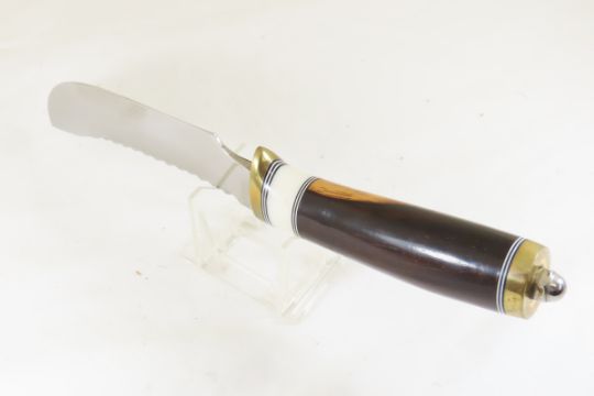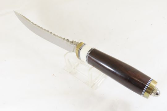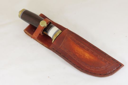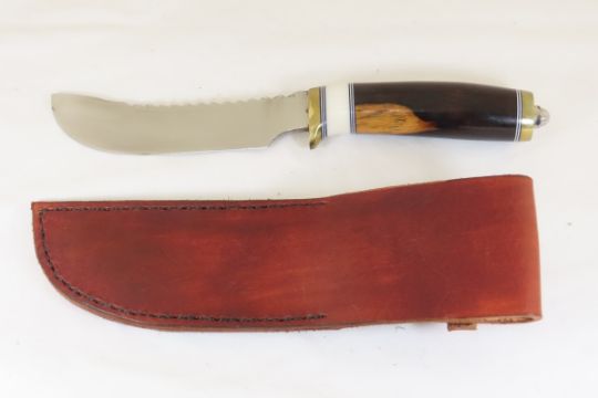Hand Made Custom Knife by Dr. Robert E Molenaar 5160 steel blade with file work, brass guard & butt, fiber & Corian spacers. Desert ironwood handle blade measures 5.5 inches, 10.5 inches overall, includes hand tooled leather Sheath. Signed R.E.M. Please ask questions & read terms and conditions before bidding.