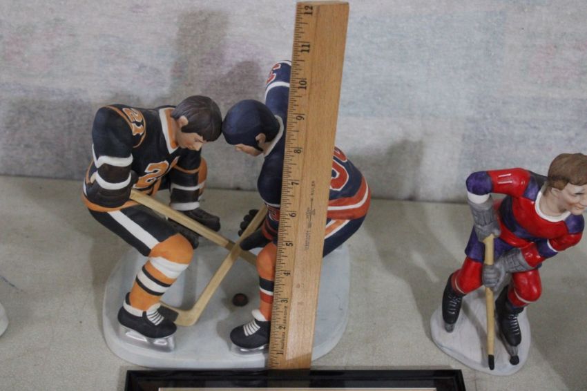Budweiser Center Ice Stein, Enesco Champions Face Off & Champions Clear Ice, Lefton Hockey Player Figurine & Slap Shot Framed Picture all as pictured. Please ask questions & read terms & conditions before bidding.
