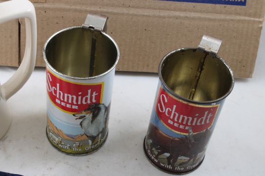 Volk Brewery Great Falls Montana Pilsner Beer Box, Schlitz Draught Beer Ceramic Stein, 2 Schmidt Great Outdoors Tin Beer Mugs, 2 Miller Lite Pilsner Beer Patches (one is a jacket patch 7 3/4" in diameter. All aspictured. Please ask questions & read terms & conditions before bidding.