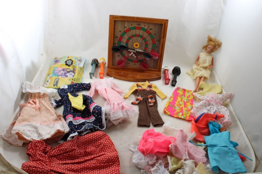 1966 Barbie Doll & Clothes for Barbie & 1 outfit for Ken (no tags), Unopened Lego Photo Holder Cube Set #30557, Magnetic Dart Board with Darts, 4 PEZ characters all as pictured. Please ask questions & read terms & conditions before bidding.