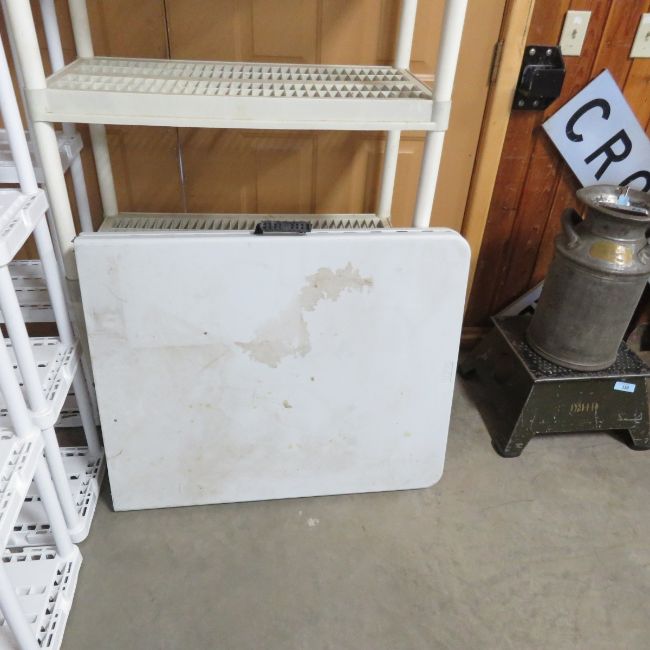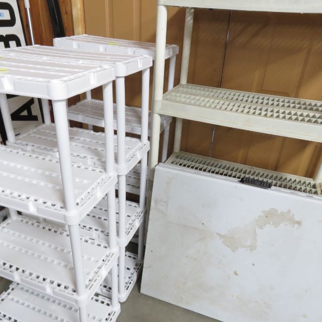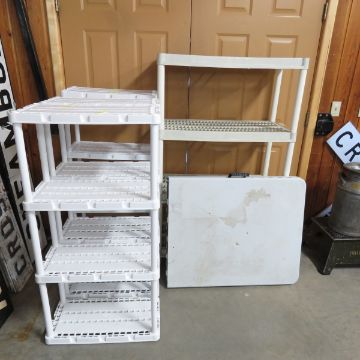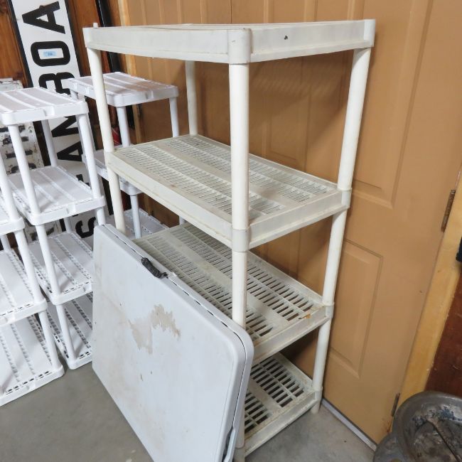 4 Plastic Shelves & Folding Table - Please ask questions and read terms & conditions before bidding.