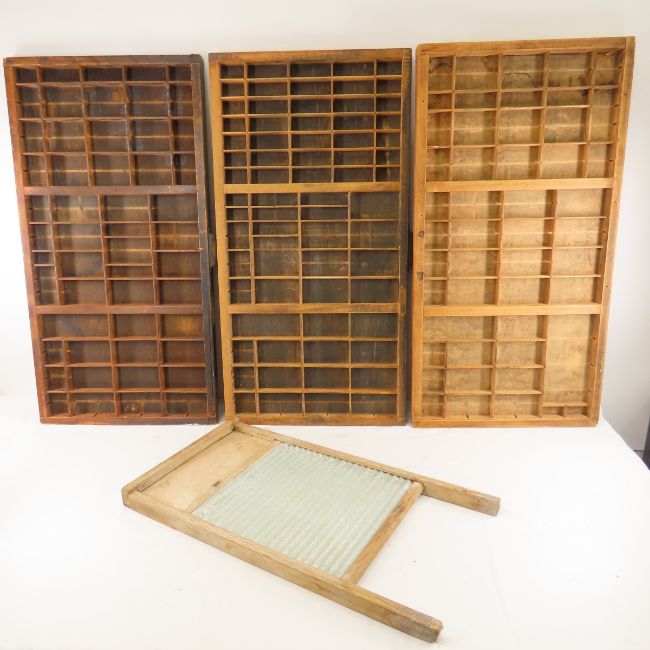3 Vintage Printers Trays & washboard - Please ask questions and read terms & conditions before bidding.