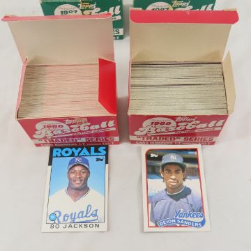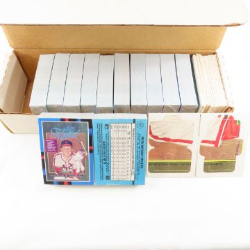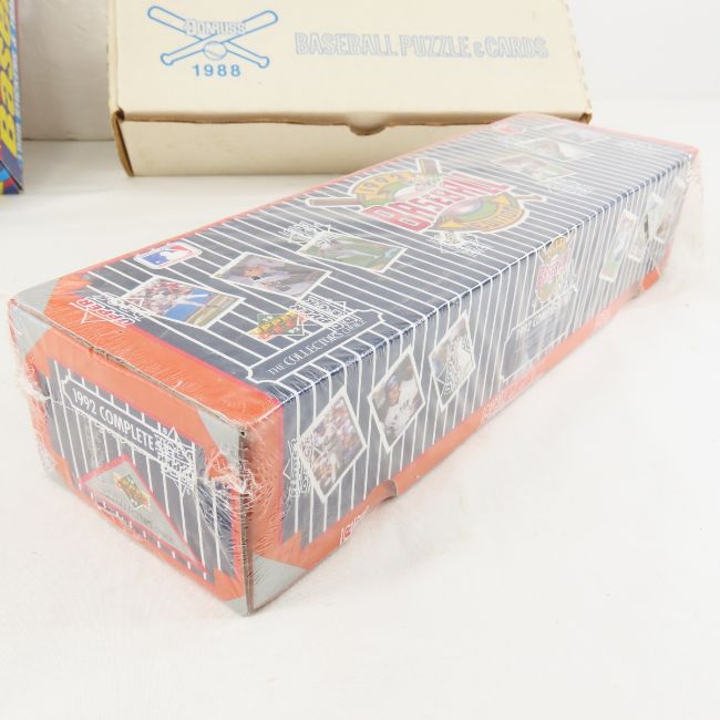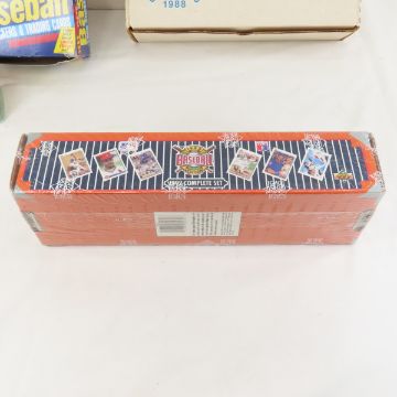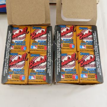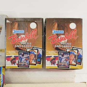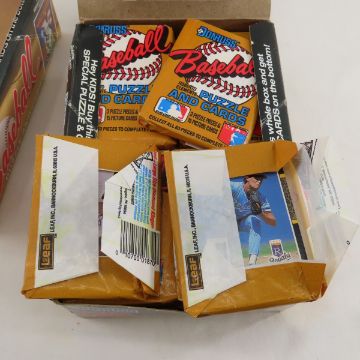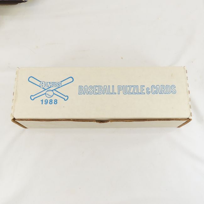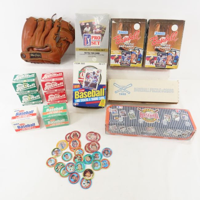 1980's Golf Cards, Baseball Cards & Glove -2 counter boxes Donruss puzzle card boxes- not full, 1988 Fleer counter box of logo stickers & cards- not full, 1988 Donruss puzzle & cards box- sealed bundles, 1992 Upper Deck sealed box, sealed PGA tour box,1986, 1987 (2), 1989 Topps Picture card "Traded" series- open boxes, 1986 (open) & 1987(sealed but loose) Donruss logo stickers & Cards, and bag of bottle caps Please ask questions and read terms & conditions before bidding.
