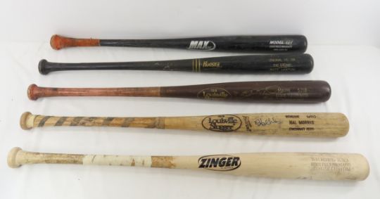 5 game Used Baseball Bats- some signed -1)HAL MORRIS #23 Cincinnati Reds autographed 125 Louisville Slugger Genuine M110 (cracked). 2) EDDIE TAUBENSEE #10 Cincinnati Reds signed Genuine S318 125 Louisville Slugger (cracked). 3) Zinger Model X53Custom Sioux Falls Pheasants- autographed by #13- possibly Peter VandenBout. 4) Model 141 (cracked) Sioux Falls Pheasants Pro Ash 34 Max Bat. 5) The Dream MATT LAWTON Original HB 250 by Hoosier (cracked).Sioux Falls Pheasants were only named thus for 3 years 2010-12 Please ask questions and read terms & conditions before bidding.