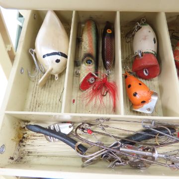 Plano Tackle box filled with lures and gear - Please read terms & conditions and ask questions before bidding.