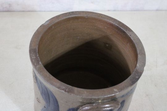 Salt Glaze Crock with Cobalt Marking - 8 1/2" Tall x 8 3/4" diameter at top rim. there is a marking on the side 1/2 inside of a circle. Please ask questions and read terms and conditions before bidding.