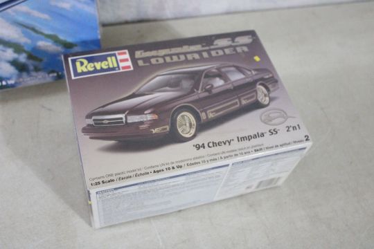 3 Vintage Model Kits - Airfix P-38F Lightning Fighter Plane #3018 1:72, Revell '94 Chevy Impala SS Lowrider 2 n 1 85-2175 1:25 Scale, Monogram F9f-5P Panther Reconnaissance 1:48 Scale. All appear to be complete & the Revell is sealed. Please ask questions and read terms and conditions before bidding.