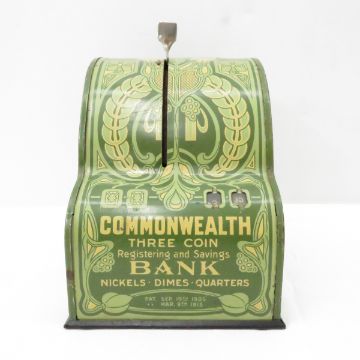 Shonk Works Commonwealth register bank - Commonwealth Three coin registering and savings bank nickels, dimes, quarters. Patents, September 19th 1905 and March 9th 1915 works as expected. Some dings and dents from age Please ask questions and read terms & conditions before bidding.