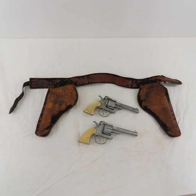 2 Vintage Kilgore Eagle Cap Guns with Holster Belt - beige grips with eagles, both working, Hopalong Cassidy belt and 2 Holsters, box of bang caps Please ask questions and read terms & conditions before bidding.