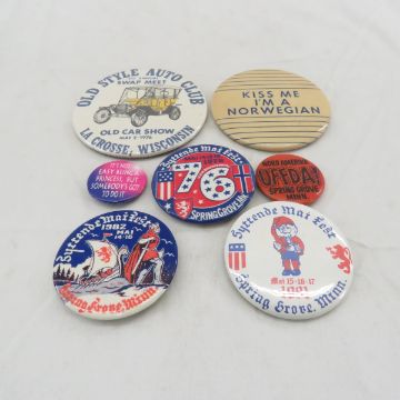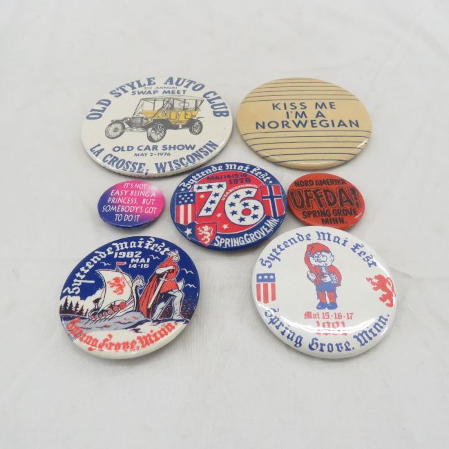 Collection of Vintage Pinback buttons - Most are MN & IA, many Norwegian festivals Please read terms & conditions and ask questions before bidding.