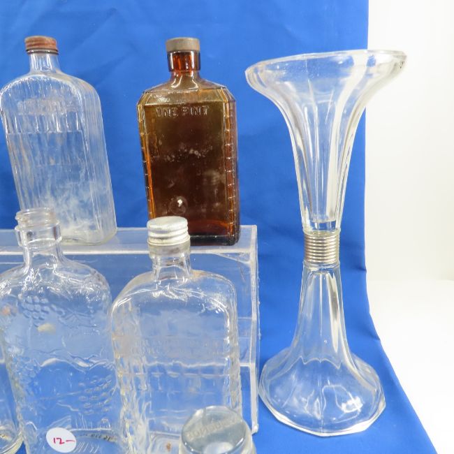 Antique Wine & Liquor Bottles & Glass Supports - Glass shelf Supports, many prohibition era bottles Please read terms & conditions and ask questions before bidding.