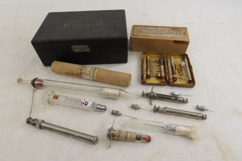Antique Adams Hemometer, Glass Syringes & More - concentrated diphtheria anti-toxin, "Century Ear and P Syringe" in wood case. Many items from this collection are from Dr. Thomas Russell and the Itasca County Historical Society. Please read terms & conditions and ask questions before bidding.