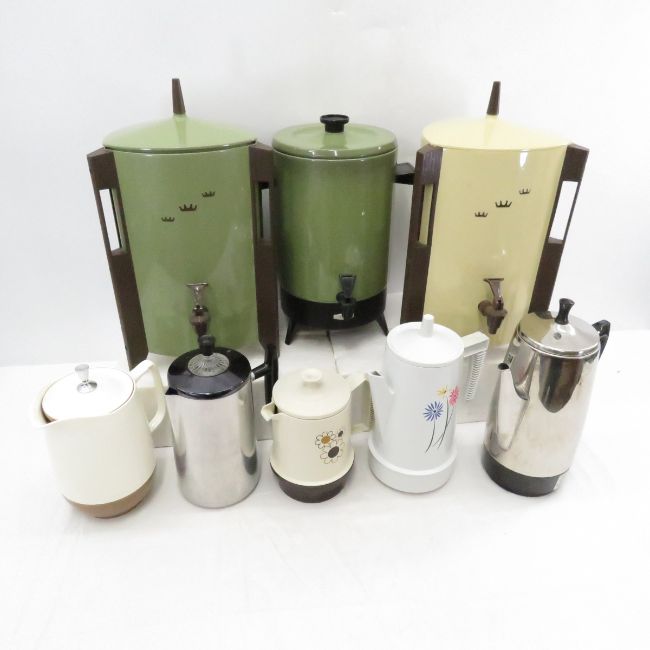 8 Vintage Coffee Pots & Pitcher - Regal, Empire, Presto, Wear Ever, Poly Perk, All Have Cords- untested Please read terms & conditions and ask questions before bidding.