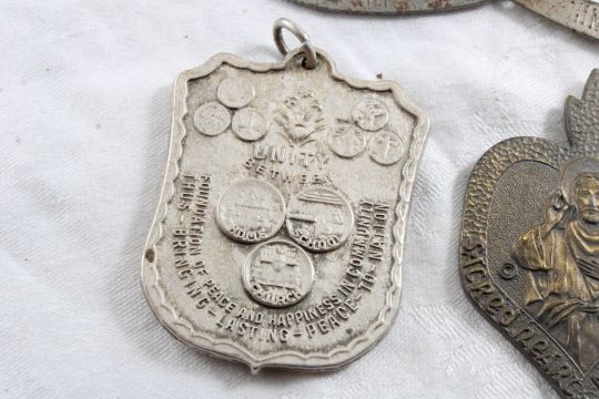 3 Antique Medallions & More - Odd Fellows FLT Medal, Malt Products Company St. Paul, Minnesota, Unity Home School Church Blessed Virgin Medal, Sacred Heart Auto League Member Medal. All as pictured. Please ask questions and read terms & conditions before bidding.