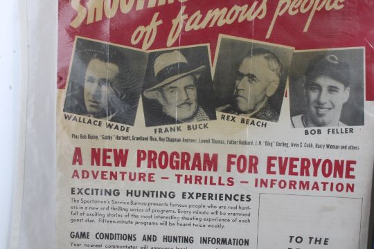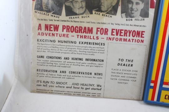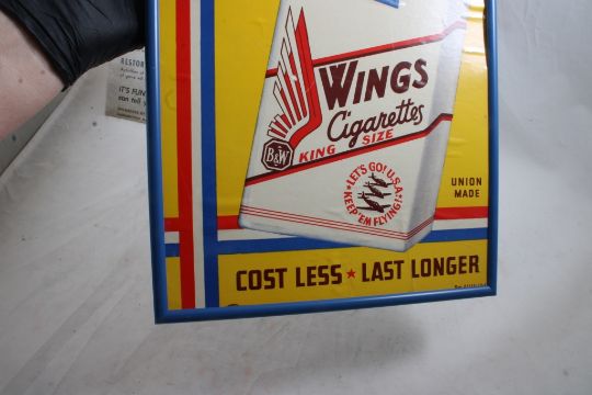 Wings Cigarette Sign, Shooting Adventures Sign - Easel Back Sign Advertising Liten to Shooting Adventures of Famous People that measures 13 1/2" x 17 3/4" with easel back & Wings King Size Cigarettes Sign that measures 10 1/2" x 15 1/2" as pictured. Please ask questions and read terms & conditions before bidding.