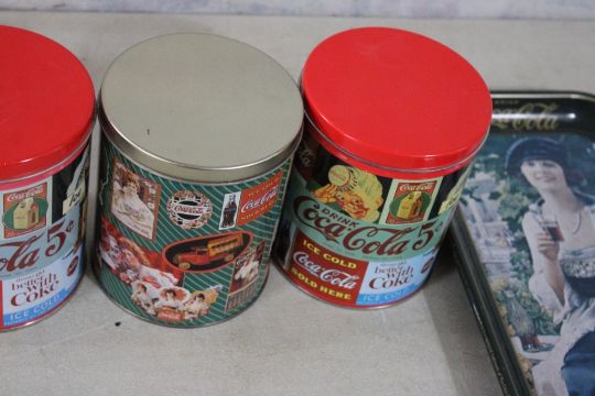 4 Coca Cola Tins w/Jigsaw Puzzles, Coke Tray - Puzzles appear complete and I believe all are 700 pieces. As pictured. Please ask questions and read terms & conditions before bidding.