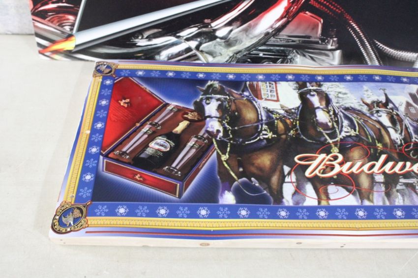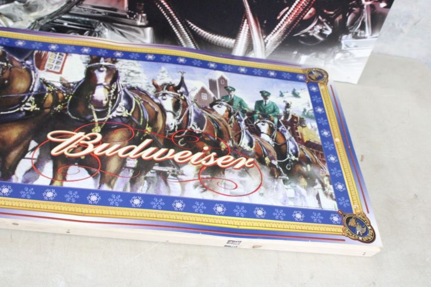 2 Large Budweiser Beer Signs w/Wood Backing - Signs measure 22 3/4" x 46 1/2" and 18" x 38" both as pictured. Please ask questions and read terms & conditions before bidding.