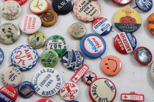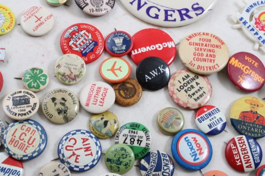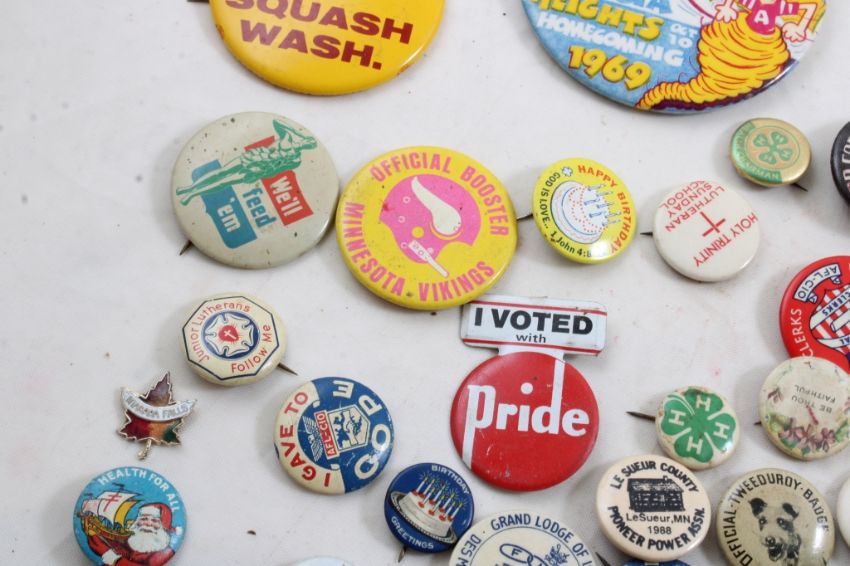 Wide Variety of Pinbacks - As pictured. Please ask questions and read terms & conditions before bidding.