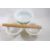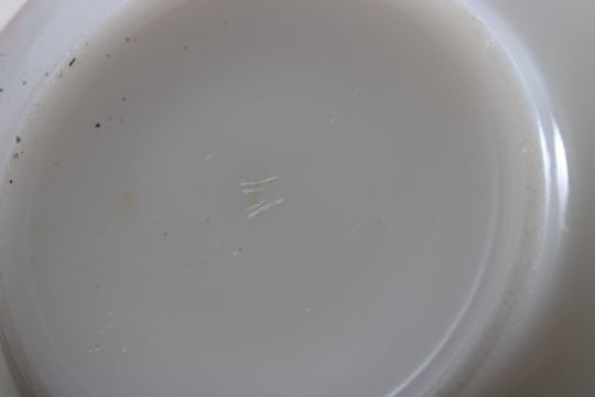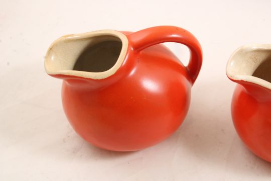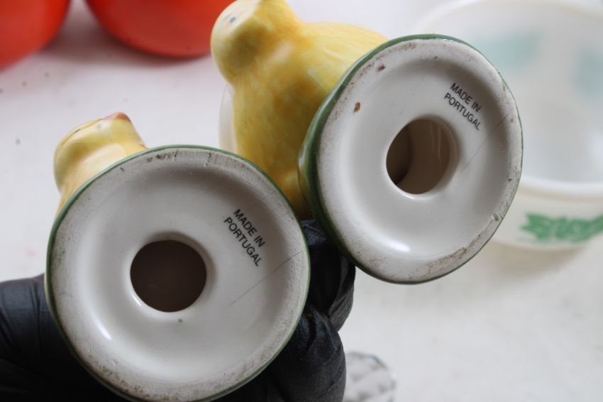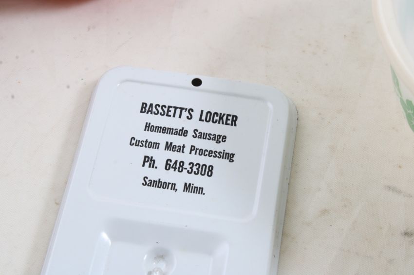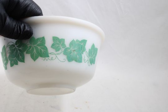 3 Hazel Atlas Ivy Bowls, Thermometer, 2 Pitchers - 3 Hazel Atlas Ivy Leaf Nesting Bowls 2 5" & 1 7" Bowls, Metal Advertising Thermometer Bassett's Locker Meat Processing Sanborn, Minn., 2 Chick Egg Cups made in Portugal, Crystal Perfume Stopper, 2 Unsigned OhioPottery Orange Ball Pitchers. All as pictured. Please ask questions and read terms & conditions before bidding.