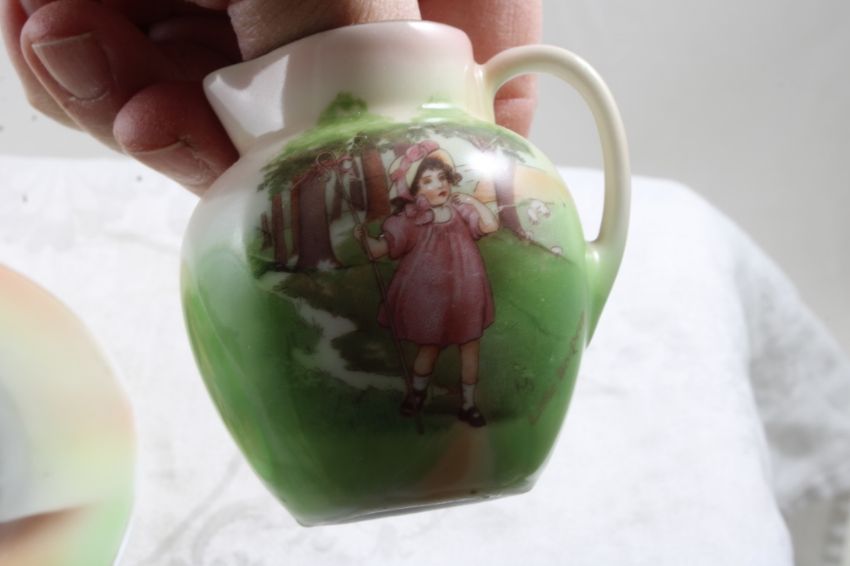 Royal Bayreuth Nursery Rhyme Pitcher/Plate - Jack in the Beanstalk 6" Diameter Plate and Little Bo Peep 2 3/4" Pitcher both made by Royal Bayreuth and as pictured. Please ask questions and read terms & conditions before bidding.