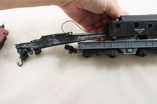 American Flyer Train Accessories - Billboard, Milk Car, Crane, Log Car, Lumber Car. All as pictured. Please ask questions and read terms & conditions before bidding.