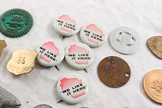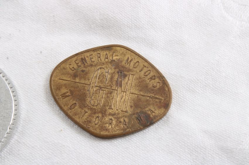 Pinbacks, Advertising Tokens, Medallions - 1955 General Motors Motorama, Seagrams 80 Years, "66" 2 brass pins, Crystal White Laundry Soap token, Richard Nixon Presidential Coin & More as pictured. Please ask questions and read terms & conditions before bidding.